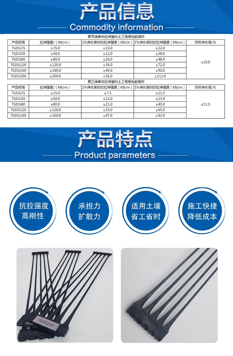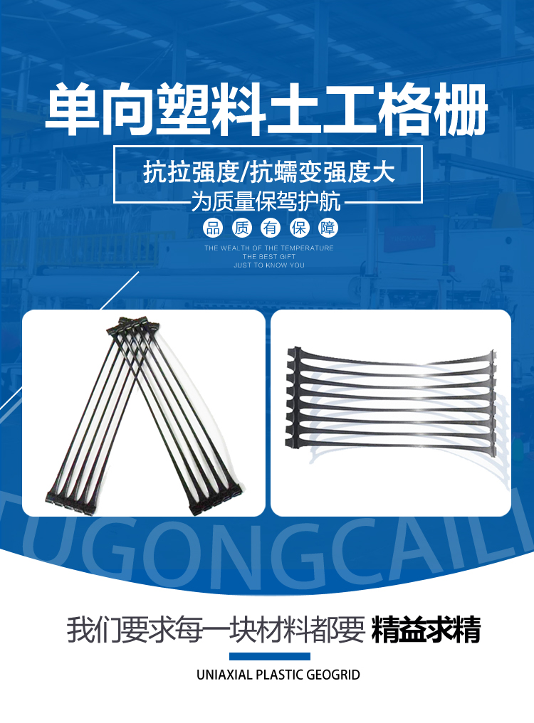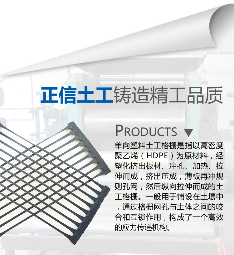 單向塑料土工格柵是指以高密度聚乙烯(HDPE)為原材料,經(jīng)塑化擠出板材、沖孔、加熱、拉伸而成,擠出壓成,薄板再沖規(guī)則孔網(wǎng),然后縱向拉伸而成的土工格柵。一般用于鋪設在土壤中,通過格柵網(wǎng)孔與土體之間的咬合和互鎖作用,構成了一個高效的應力傳遞機構,使局部載荷能迅速有效地擴散到大面積的土體中去,從而實現(xiàn)降低局部破壞應力,提高工程使用壽命之目的。