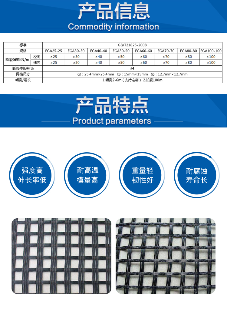 產(chǎn)品有強(qiáng)度高、伸長率低、耐高溫、模量高、重量輕、韌性好、耐腐蝕、壽命長等特點(diǎn),可廣泛應(yīng)用于舊的水泥路面、機(jī)場跑道的維修、堤壩、河岸、邊坡防護(hù)、道橋路面增強(qiáng)處理等工程領(lǐng)域,可給路面增強(qiáng)、補(bǔ)強(qiáng),防止路面車轍疲勞裂紋,熱冷伸縮裂紋和下面的反射裂紋,并能將路面承載應(yīng)力分散,延長路面使用壽命,高抗拉強(qiáng)度低延伸率,無長期蠕變,物理化學(xué)穩(wěn)定性好,熱穩(wěn)定性好,抗疲勞開裂,耐高溫車轍,抗低溫縮裂,延緩減少反射裂縫。