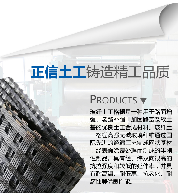 玻纖土工格柵是一種用于路面增強(qiáng)、老路補(bǔ)強(qiáng),加固路基及軟土基的優(yōu)良土工合成材料。玻纖土工格柵高強(qiáng)無堿玻璃纖維通過國際先進(jìn)的經(jīng)編工藝制成網(wǎng)狀基材,經(jīng)表面涂覆處理而制成的半剛性制品。具有經(jīng)、緯雙向很高的抗拉強(qiáng)度和較低的延伸率,并具有耐高溫、耐低寒、抗老化、耐腐蝕等優(yōu)良性能,廣泛應(yīng)用于瀝青路面、水泥路面及路基的增強(qiáng)和鐵路路基、堤壩護(hù)坡、機(jī)場跑道、防沙治沙等工程項(xiàng)目。